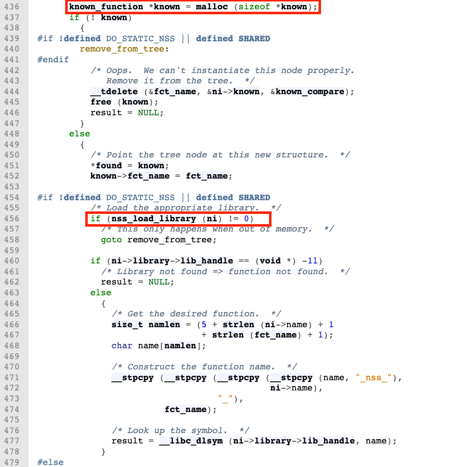 nss_load_library has some interesting thing which is this part use (dlopen) in line 359 which load an external library using the name and if check line 353 it creates a name of the shared library and passes it to (dlopen) to include it with this format (libnss_<name_from_ni>.so.<version> (i.e libnss_flex.so.2)) you can read the man page of dlopen