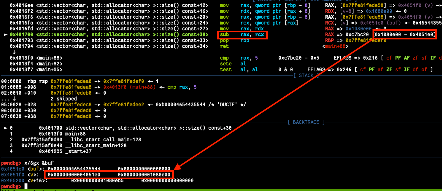 our target is to overwrite the vector values to be "DUCTF" not "XXXXX" and pass the check of the size (5), our buf is above the vector so the overflow on "buf" will control the vector ptr, so if we check the buf address we will understand the structure of the vector.